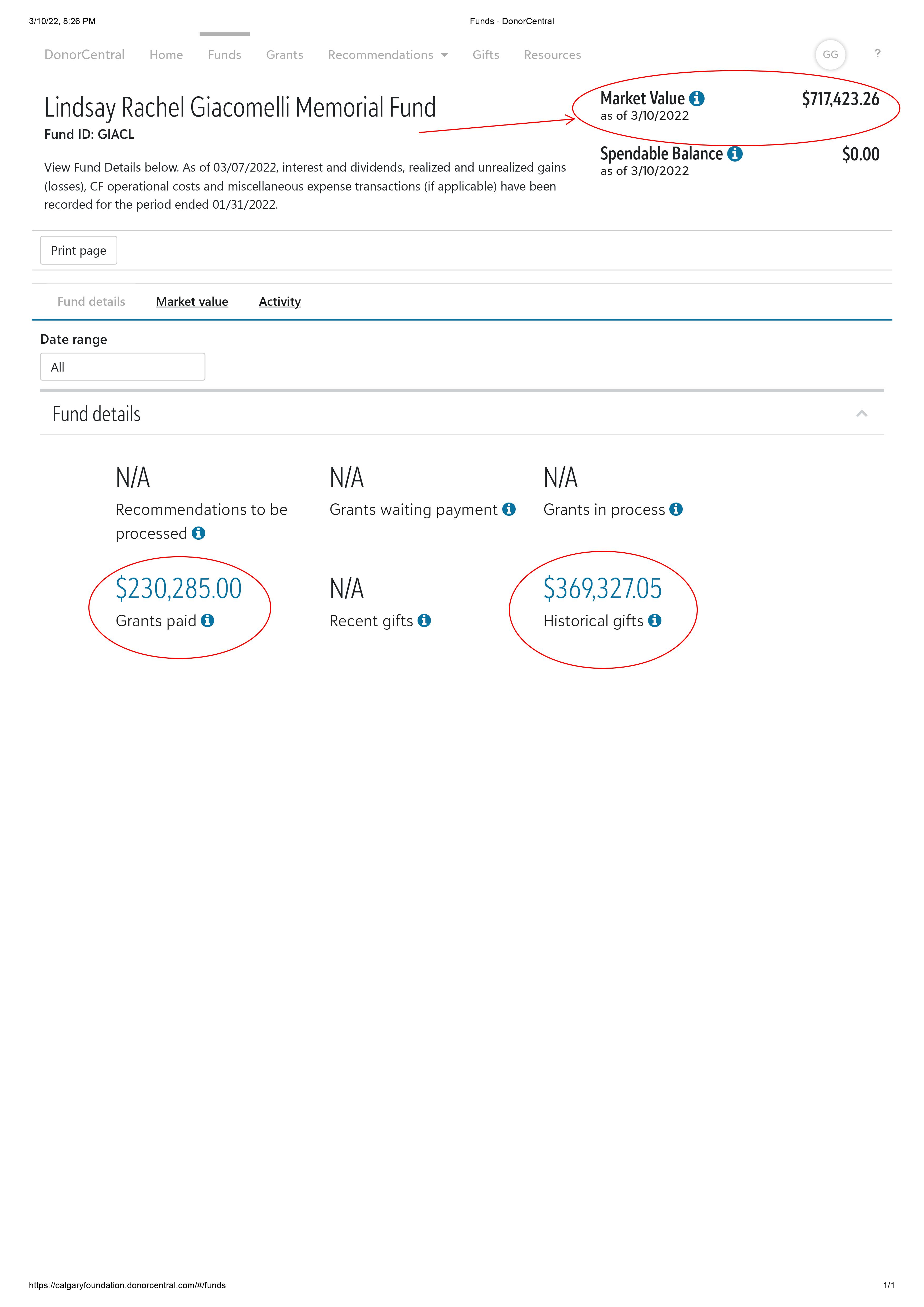 The estimated 2022 grant value based on this fund value is $28,697. Planned grants this year will be to Kids Cancer Care (~$21,697), Calgary Zoo (~ $2,000) and School of Alberta Ballet Scholarship for 3rd year student ($5,000)